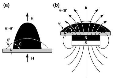 在数字微流体技术中,液滴可以在无封闭的平面上运动。分散的液滴可以作为化学或生物反应的单独反应室,也可以用作试剂的运输。在磁性数字微流体中,含有磁性颗粒(例如铁磁流体或液体弹珠)的液滴用永磁体或电磁体操纵。Nguyen等研究表明,固定的铁磁流体液滴可以通过永久磁铁变形,改变其表面接触角。观察到表面接触角随着磁场的增加而减小。他们称这种现象为磁化现象。将磁体放置在平坦的均匀表面下,如果磁力足够强,能够抵抗摩擦力和毛细管力,则液滴可以沿着平坦表面以与磁体相同的速度滑动。然而,铁磁流体液滴的一般问题是它们在许多生物分析测定中与水性缓冲液的环境不相容,因缓冲液使胶体悬浮液不稳定。