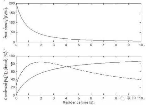 2芳香胺和双乙烯酮在一个管式反应器中,真实情况下经过乙?;⑼ü缒阅D獾贸霾饬康娜让芏?,用于停留时间和转换的功能报告中。反应的半衰期约为1.5sec,所以主要分布在动力情况中(B型反应),二阶反应说明了大部分的热密度都分布在反应的初始时期,在这种情况下,小的传统管(直径3㎜)无法提取足够的建立在流体力学(Tr)和导热液之间的热量和温度梯度。反应初期需要使用微反应器,然而一旦最初的热密度被消耗(99%的转换耗时154sec),便可使用常规的(非微型)停留时间模块。以下参数可用于仿真模拟:传热系数500w/㎡/k,流体热容量2kJ/kg/k,二阶动力学常数0.363l/mol/s,焓180kJ/mol,双乙烯酮与胺浓度15%,传热流体在25℃恒温时,未考虑活化能。