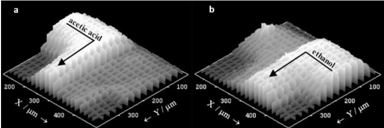 7:设计用于在893cm-1a)和882cm-1b)的拉曼谱带处合成乙酸乙酯的微流体装置的拉曼强度的3D图。用这种技术可以密切监测试剂(乙酸和乙醇)的位置,在感兴趣的位置,例如此处提供的T形接头。来自Fletcher等人的图片 “使用倒置拉曼显微分光计监测微反应器内的化学反应。