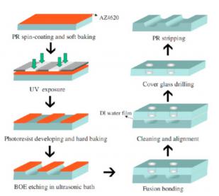 12:显示使用湿法蚀刻和熔融粘合方法的基于玻璃的微流体芯片的制造工艺的图示。Lin等人的图片 “在钠钙玻璃上制造微流体系统的快速成型过程。