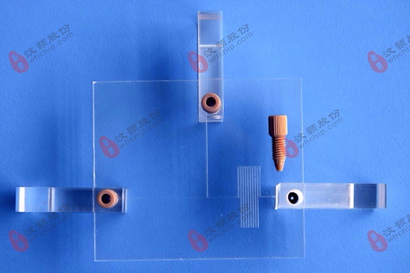 硬质芯片C型夹具主要用玻璃、PMMA等硬质微流控芯片进出样,具有连接方便,避免了胶水粘结剂的使用;移位方便,便于观测;可重复使用;成本较低等特点。